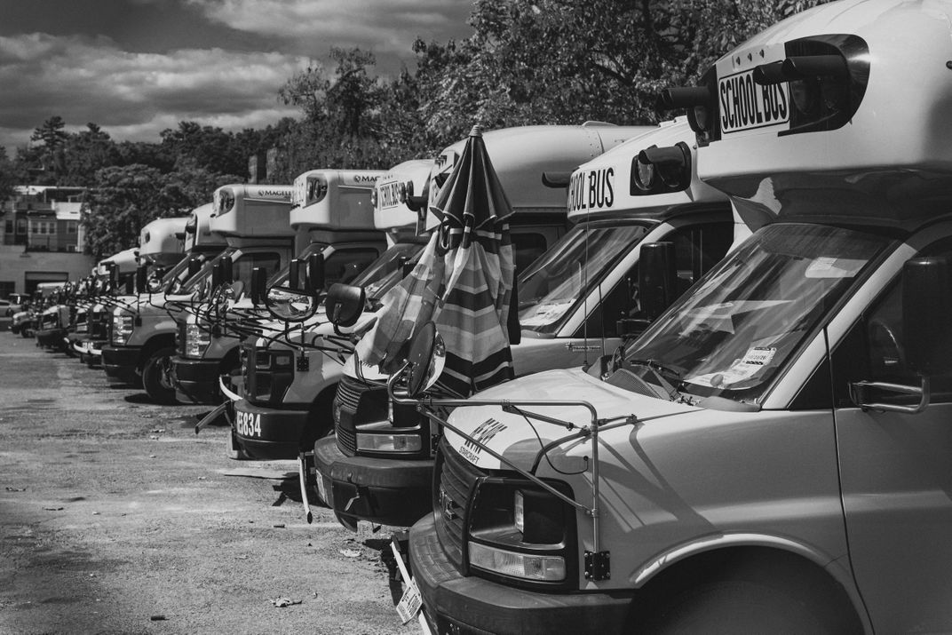 A long line of busses, sitting dormant in the lot at the end of the day.