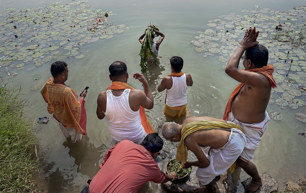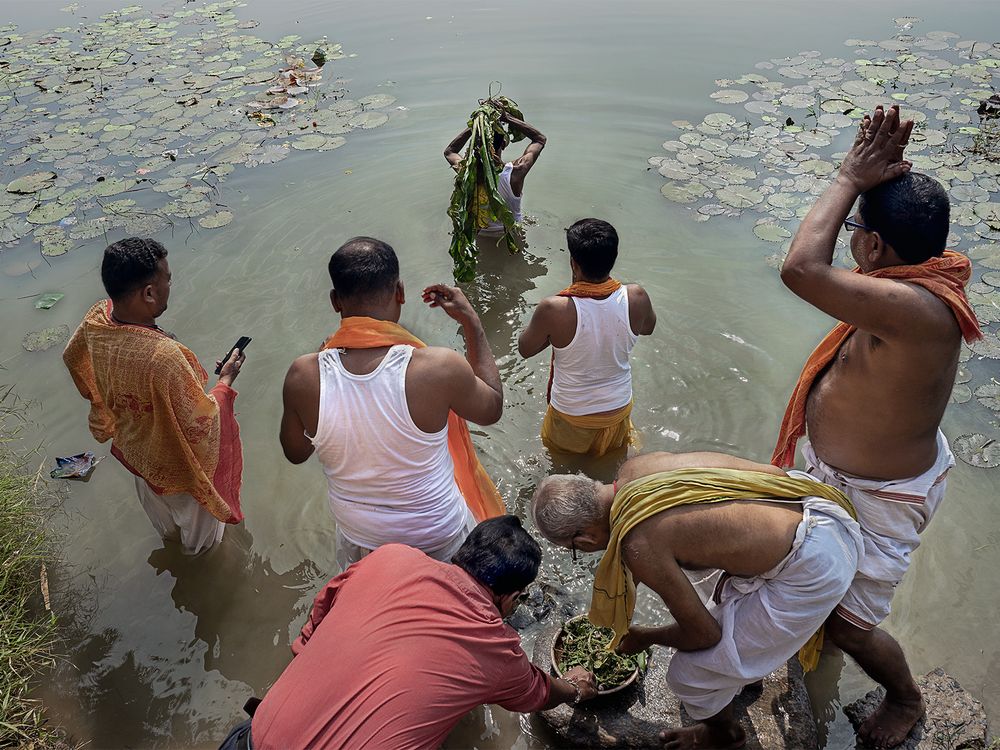 In the morning of last day of Durga puja , people of rural bengal gather to complete the bath of Kala bou that means wife of god Ganesh.Event is happening here in a locale pond.