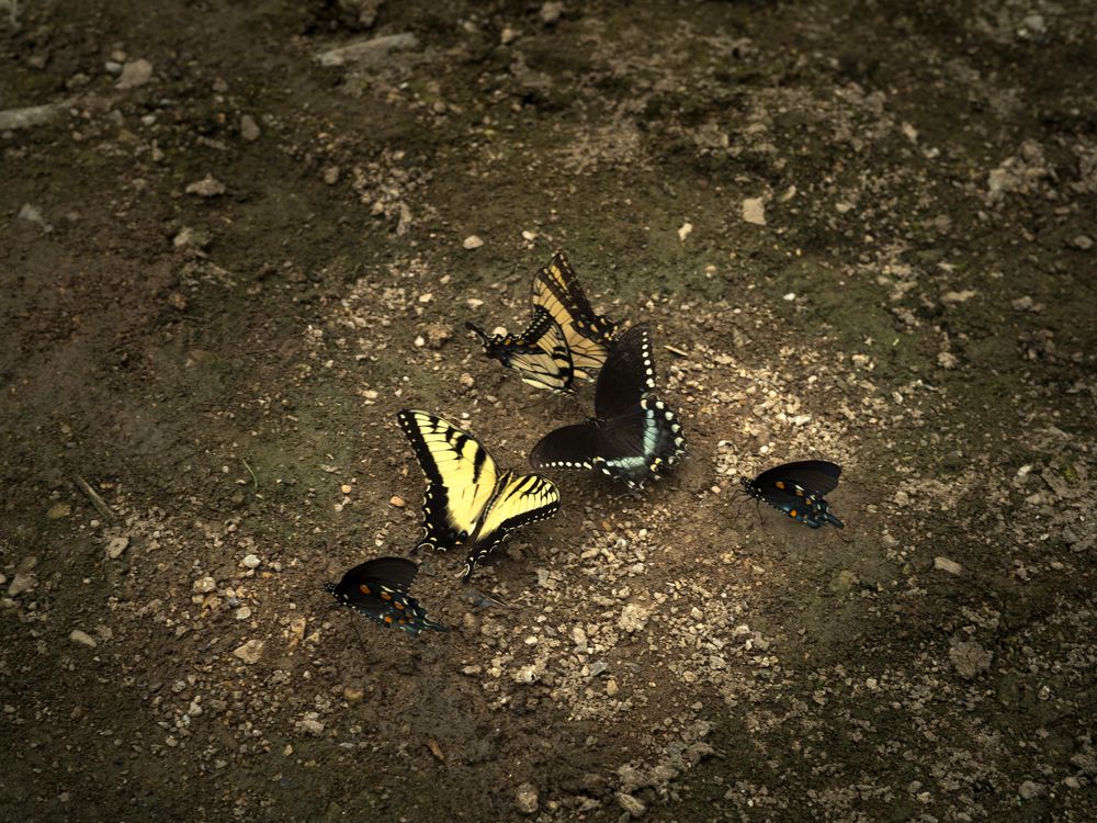 Butterflies can sometimes be seen clustered on muddy riverbanks, a behavior known as "puddling." This is a way for them to get vital nutrients that are absent from their usual diet of nectar. This group of Tiger Swallowtail and Black Swallowtail butterflies are puddling on the banks of the Duck River, in Maury County, Tennessee.