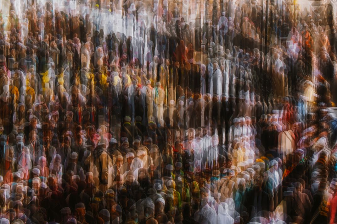 motion ripples outward, each figure blurring into the next in a cascade of color and energy. Like a butterfly effect in human form, the layers of movement and vibrant primary hues transform a fleeting moment in Saudi streets into a dynamic abstract composition, capturing the chaos and beauty of collective motion.