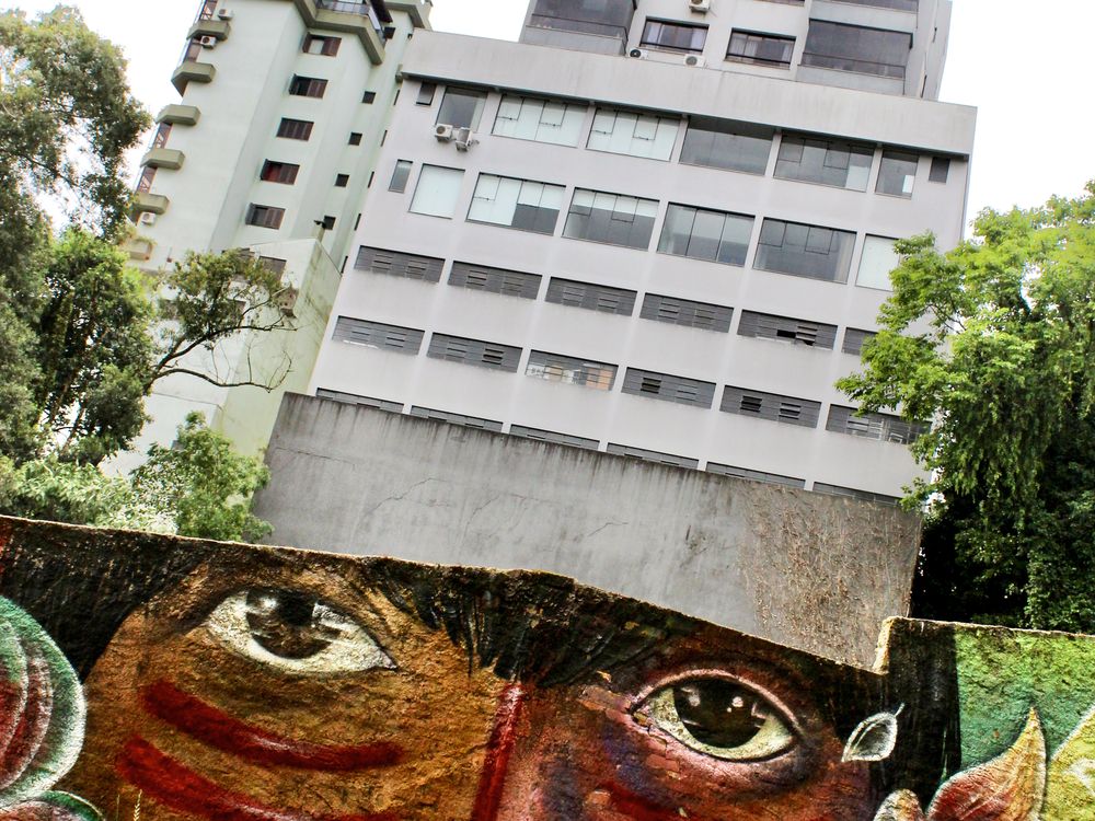 Essa imagem foi registrada em um parque da cidade onde moro. A cidade onde moro teve uma colonização italiana, mas antes já habitavam indígenas. A imagem, de uma pintura em um muro, tem aos fundos um prédio da área central da cidade. Os indígenas que aqui habitavam agora estão morando na periferia.