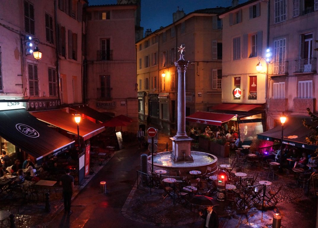 While the upper floors of many of the buildings in this part of Aix en Provence seemed void of inhabitants, at street level was this beautiful collection of restaurants and cafes where everybody congregated. I loved the painterly look of the scene at night.