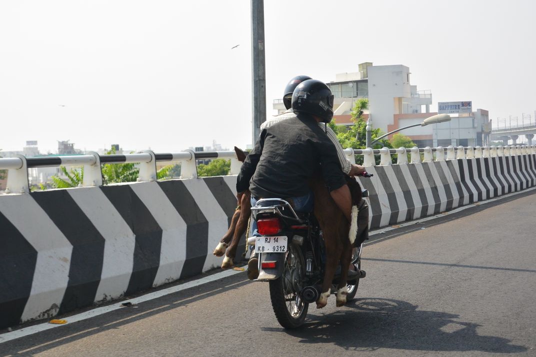 Traveling from New Delhi to the next city on the highway I look out the window to see two men on a motorcycle and the passenger was holding a calf.