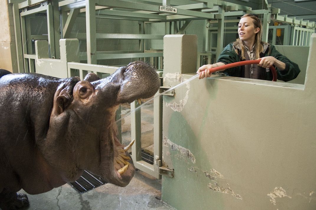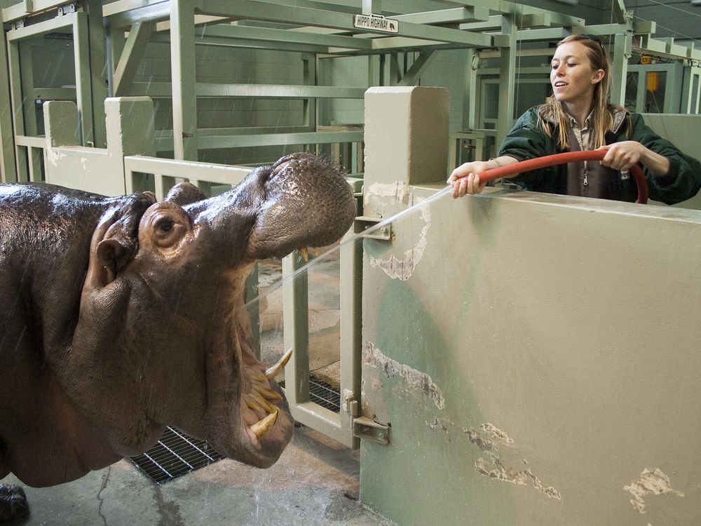Calgary zookeeper, Valerie Edwards, taking a water break.