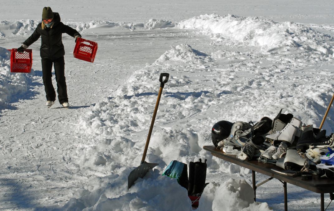 At the top of a new year, a community hosted an outdoor winter festival program at a frozen beachfront. Included was a learn to ice skate program which included stacks of skates which could be loaned. Returning from the ice, a would be skater carries and returns milk crates which are used for balance.