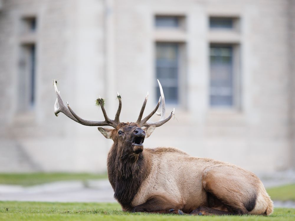 Autumn is rut session of Elks. A bull elk, in front of the Yellowstone National Park Headquarter building, was calling and chasing a herd of elks cows that are the residents of Mammoth Hot Spring area. It show people and animal can share common areas if we can manage it well.
