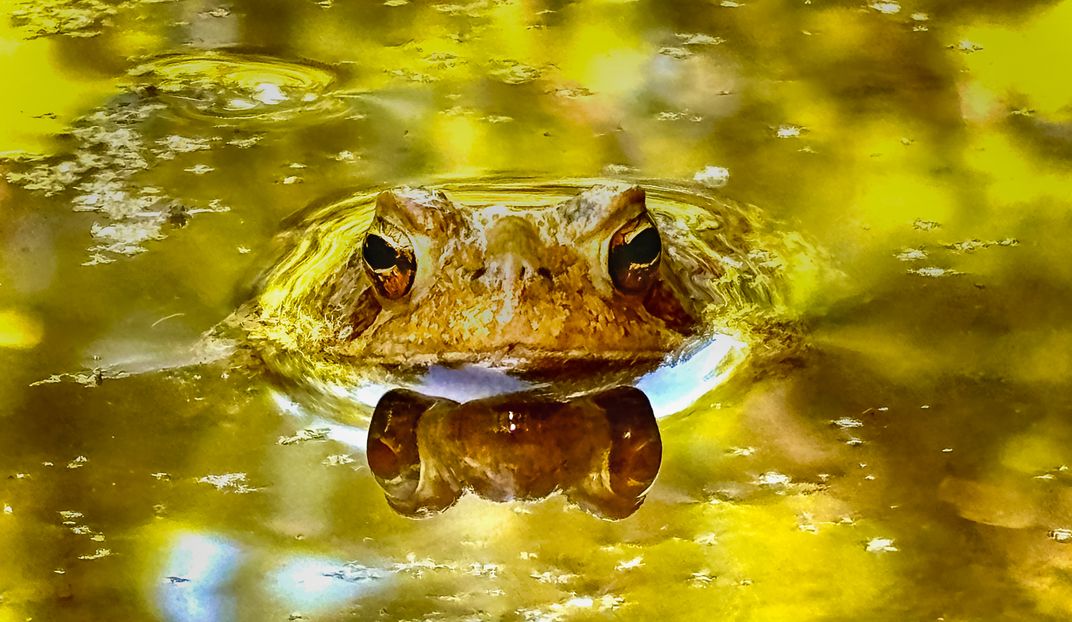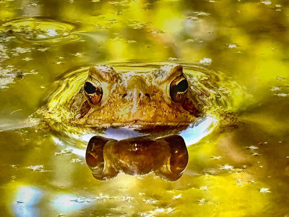 A frog rises quietly to the water’s surface, its eyes surveying the wetland with steady focus.