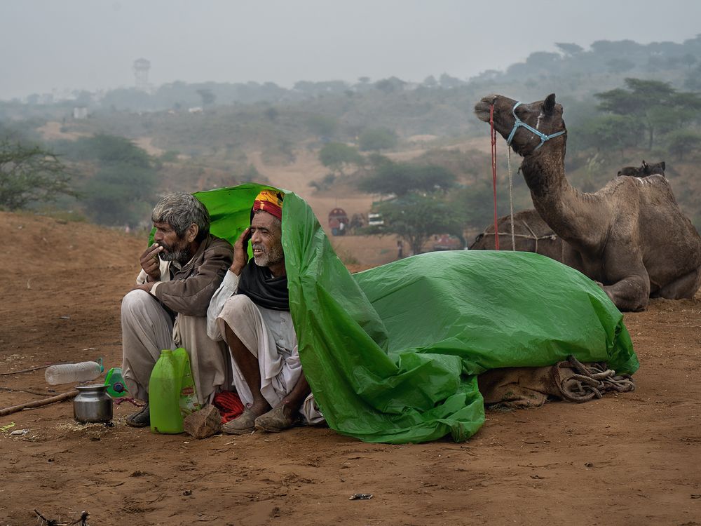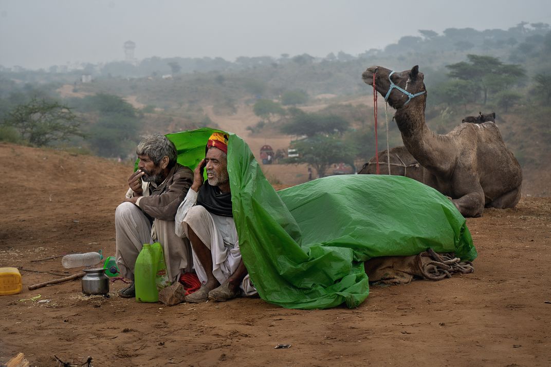 Two camel sellers sit under a green tarpaulin on a cold, misty morning after a brief rain, sharing warmth as their camel rests beside them. With few buyers in the rain-soaked Pushkar ground, they wait in quiet hope amid the soft desert haze.