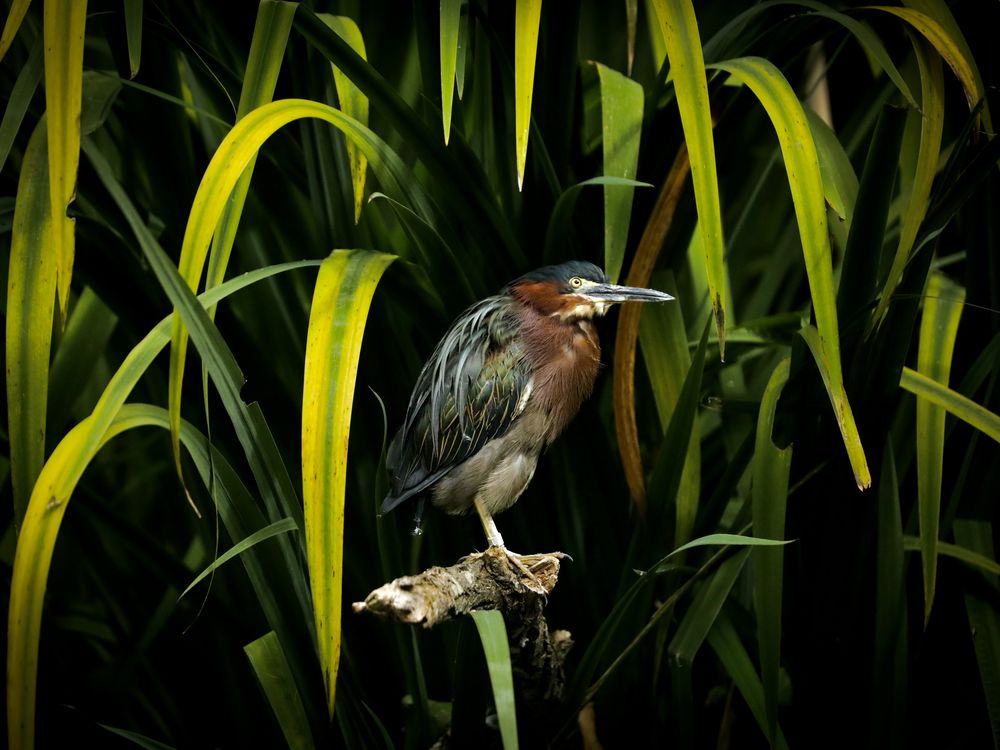 A Green Heron sits patiently on a branch surrounded by camouflaging plant fronds in an aviary in the Woodland Park Zoo.