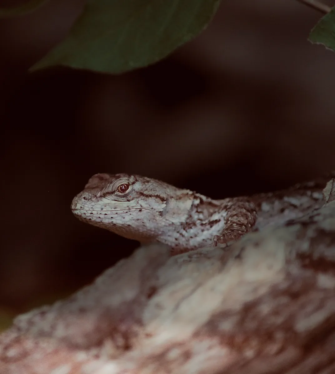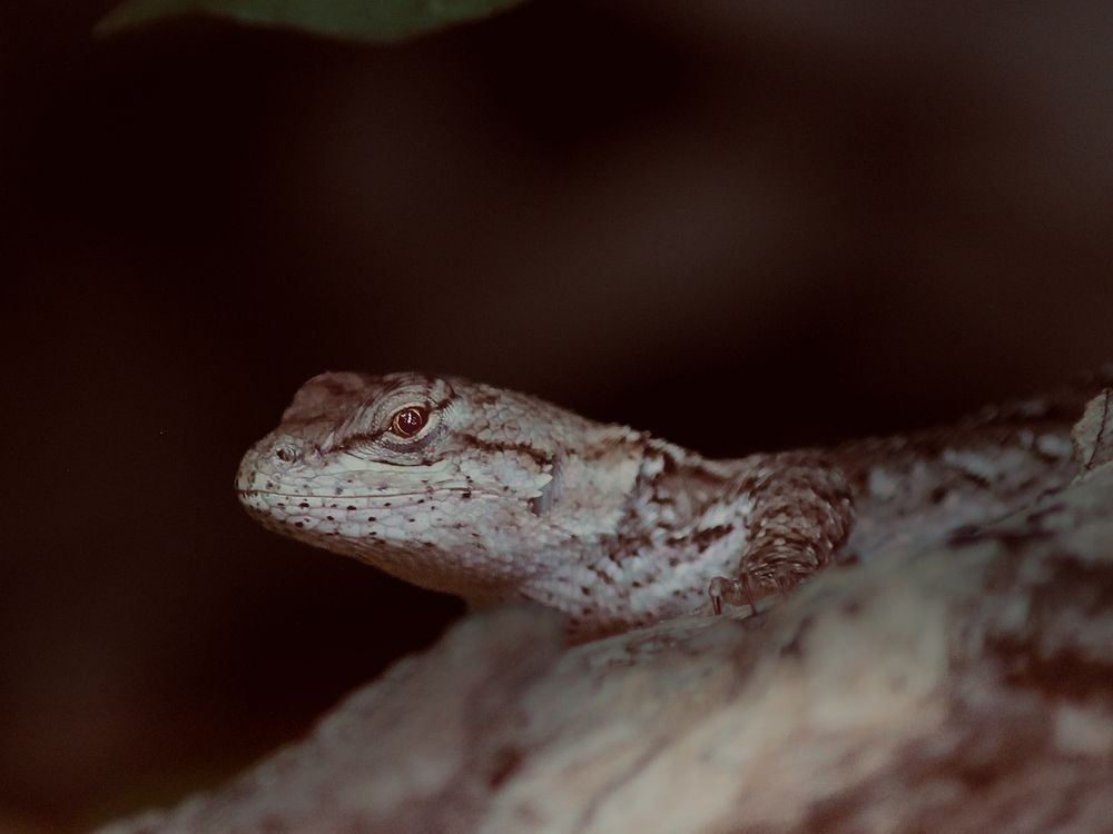 A lizard rests motionless on tree bark, relying on perfect camouflage to stay unseen.