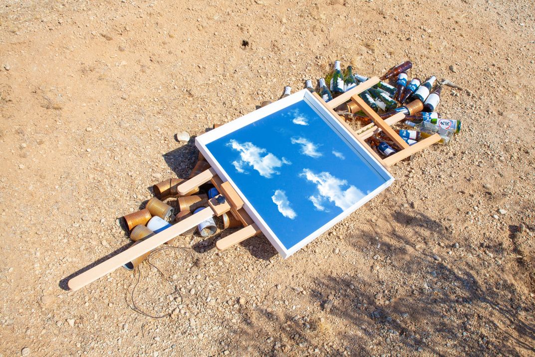 A fallen easel lies in the dirt, surrounded by bottles and cans. Instead of a canvas, it holds a mirror reflecting a perfect blue sky with clouds. The scene contrasts beauty and decay.