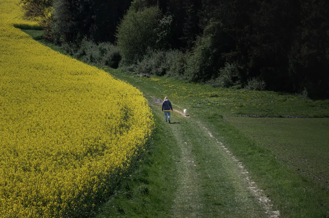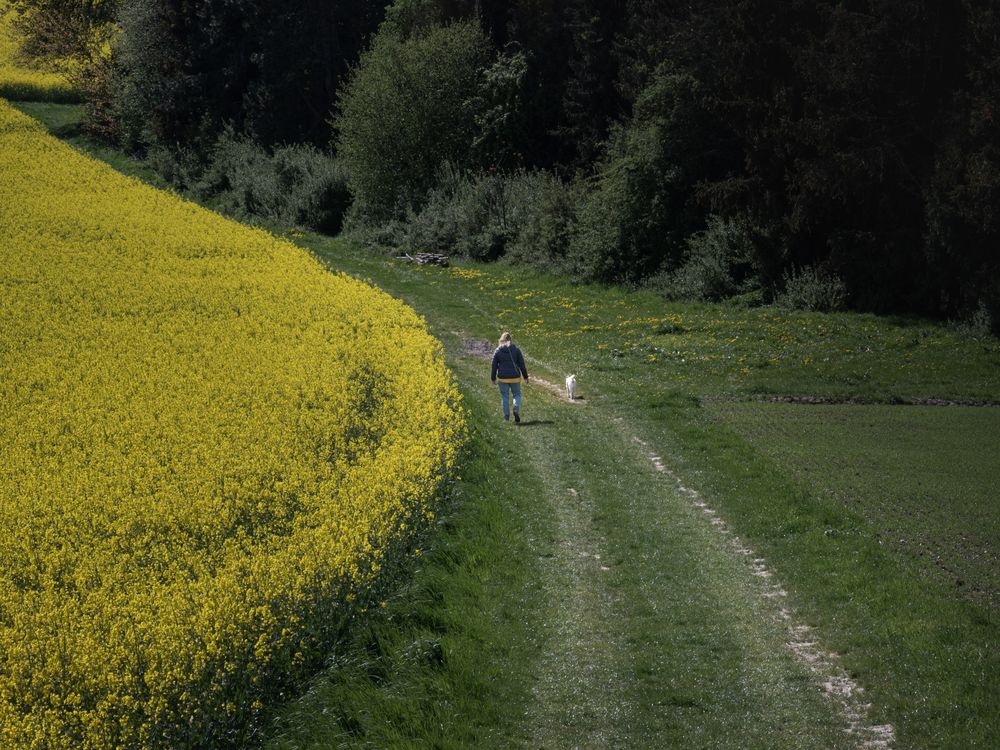 A lady and her dog joggling along the path beside a bright yellow canola field in spring