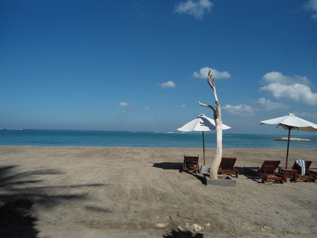 White sandy beach with calm blue ocean. Wish you were here, at the quiet Kuta Beach, Bali, Indonesia.