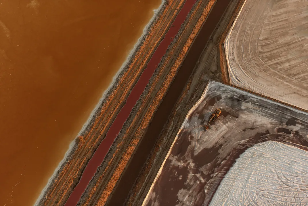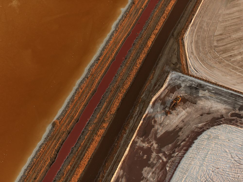From above, the San Francisco Bay salt flats unfold as a vivid abstract painting—bands of rust, crimson, and ochre blending seamlessly with the pale, crystalline textures of harvested salt. The geometric divisions of ponds and levees trace the rhythm of an ancient process shaped by sunlight, evaporation, and time. At the edge of this vibrant mosaic, a solitary excavator rests on the pale surface, its presence a quiet testament to human precision amid nature’s artistry. Here, industry and environment merge—the sculpted lines of salt and machinery forming a landscape that is both functional and profoundly beautiful, a meeting of elemental forces under the golden light of the Bay.