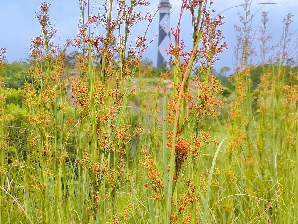 I took this at Cape Lookout on the Outer Banks. It had been a rainy day, but the blue color in the clouds and green and orange in the brush made a great frame for the lighthouse.