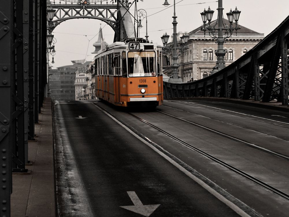 Capital of Hungary, Budapest, During December 2012. Old surface metro crossing one of the many bridges that crosses the river Danube.