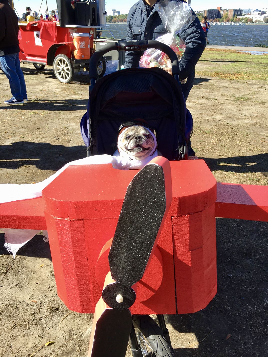 Capone is a 14 year old pug with a neurological condition that affects his back legs. He regularly rides in a stroller to get around Boston so this year we decided to be Amelia Earhart and fly around town!