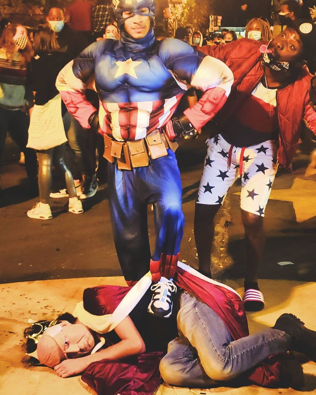 a protest against trump in the night of the elections in front of the White House. the photo shows a man wearing captain America uniform beats a man wearing trump mask.