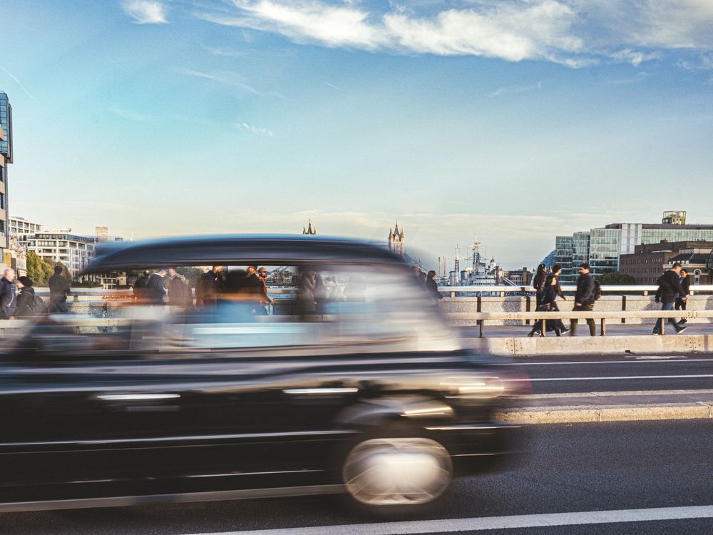Capturing London's Pace: Black Cab Blurs Past Tower Bridge