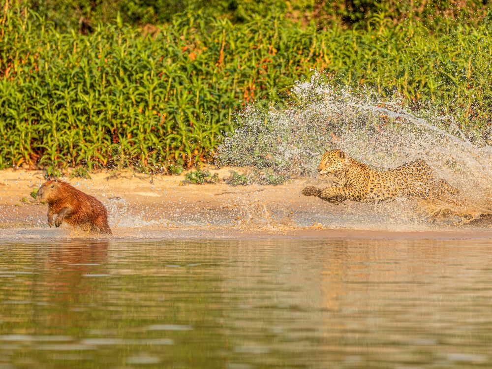 We were on our way back to our lodge when we sighted a solitary jaguar crouch up close to a pair of unsuspecting capybaras. The jaguar eventually made a dash for the capybara which was further away from the water. The capybara, however, turned at the last minute to elude the jaguar.