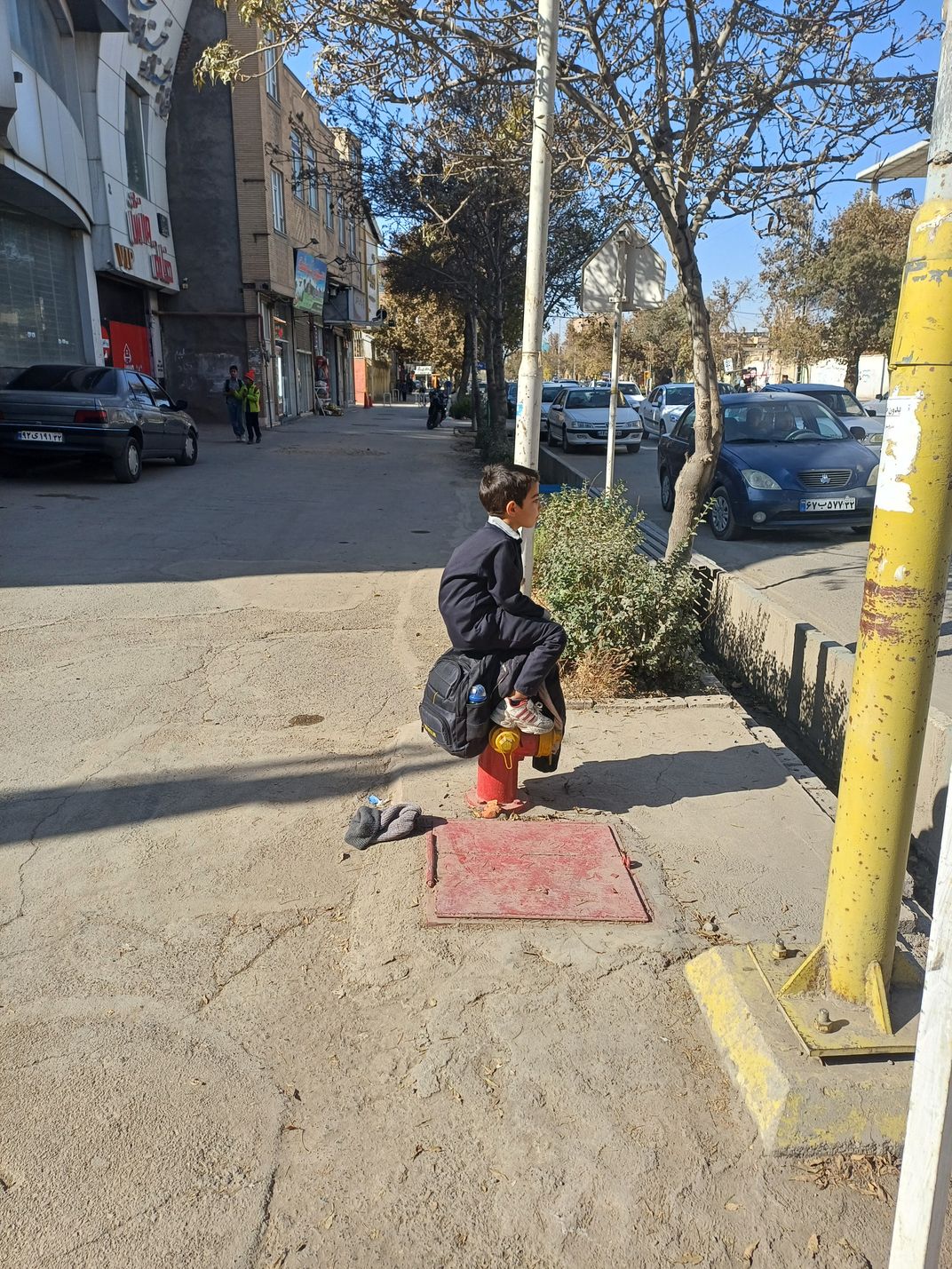 It was interesting to see the student sitting on the hydrant, ignoring his hat and just looking at the cars.