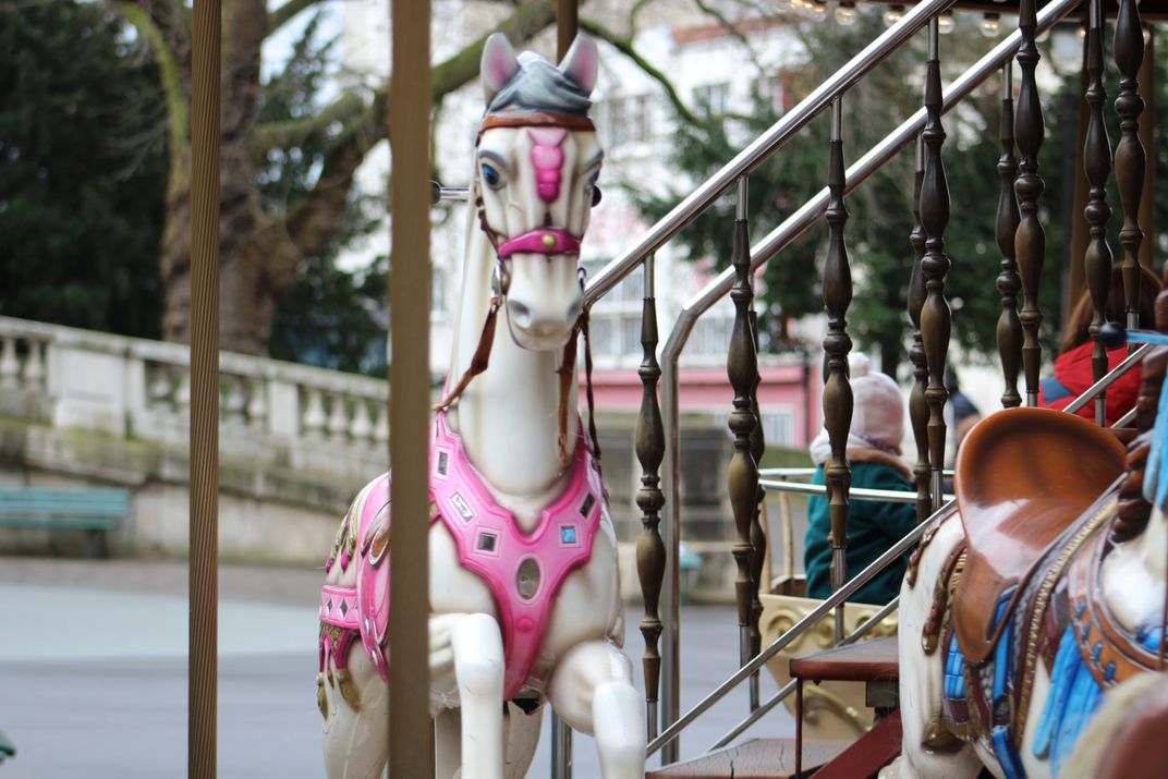 This is one in a series of pictures of this carousel horse, and it looked like a race to me. I was caught by the bright colors of the pink horse. I was made to stand out among the other horses.. She seemed intense.