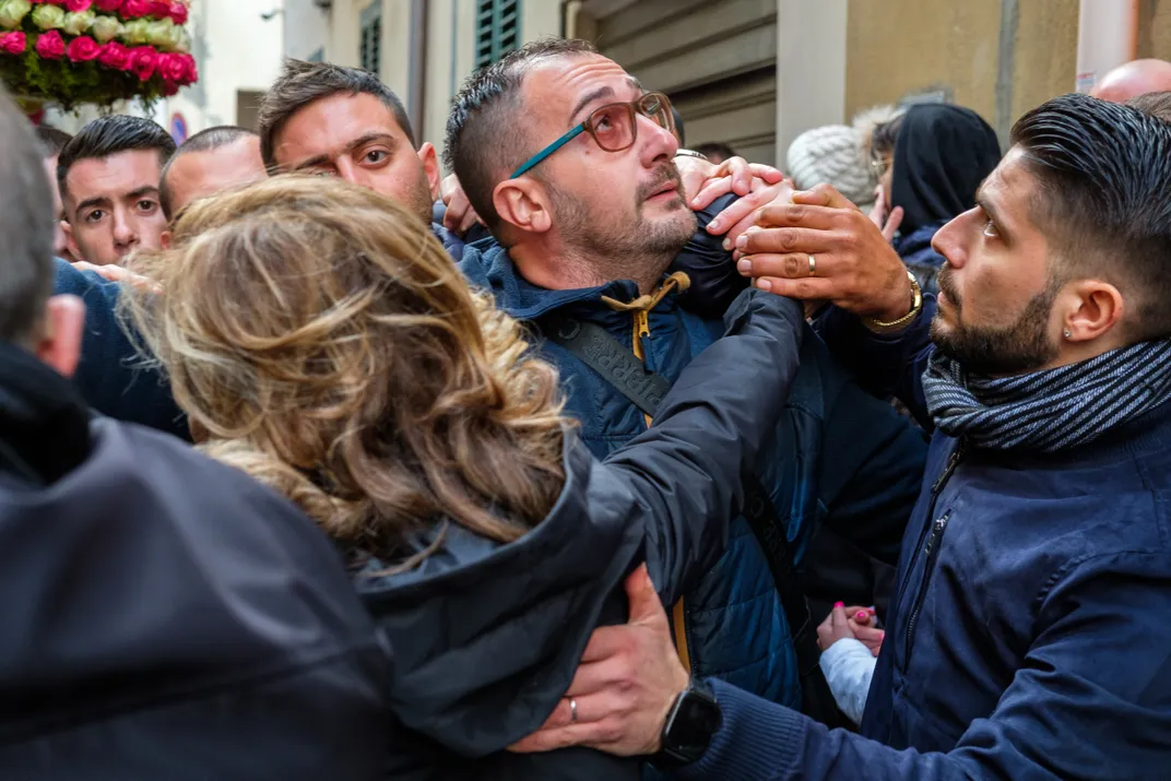 Carriers at "I Misteri" the 24hour Holy Week Procession in Trapani, Sicily. Around 20 heavy floats representing the stations of the Cross are carried through the streets of the city for about 24 hours