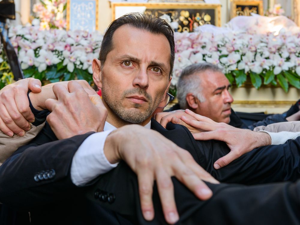 Carriers at "I Misteri" the 24hour Holy Week Procession in Trapani, Sicily. Around 20 heavy floats representing the stations of the Cross are carried through the streets of the city for about 24 hours