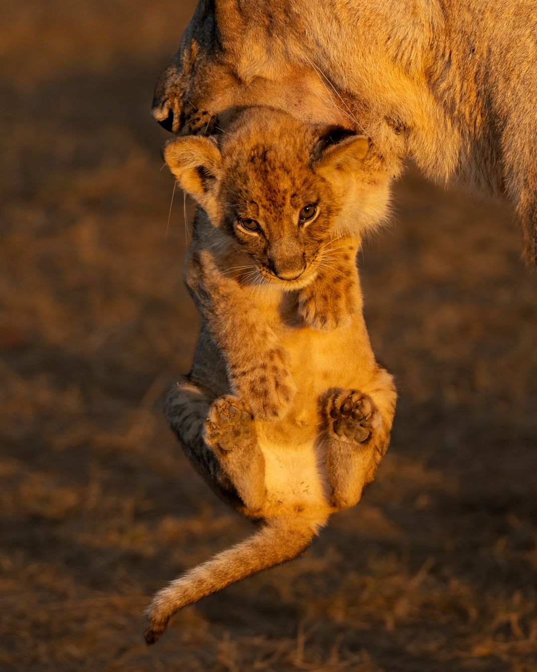 At sunrise in Zambia a lioness carries her cub to safety, moving with the weight of a mother who has already lost one. The tiny cub hangs quietly, unaware of its uncertain future or the dangerous world it has been born into, trusting entirely in her strength.