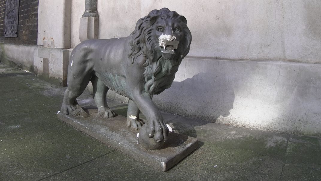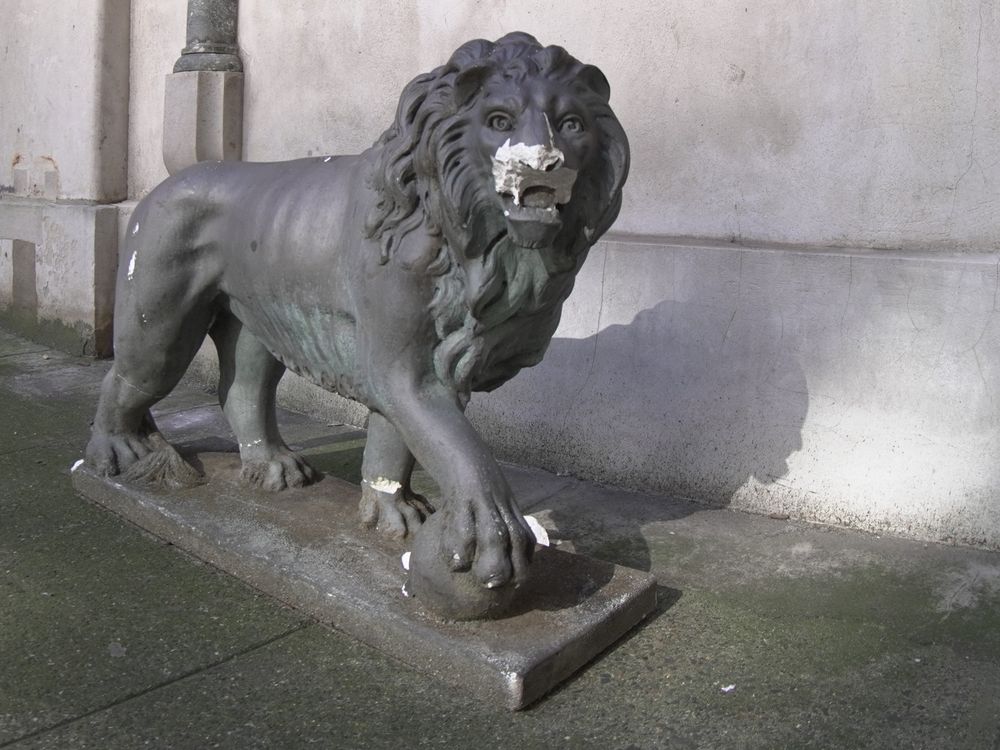 This is a small lion statue that has been left out, uncovered, now damaged with paint around the mouth, nose and splashes on the paw making it look like a domestic cat returning from a pot of cream.