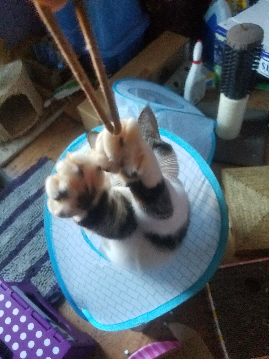 I was playing with my cat, dangling a ponytail holder, which she loves, and I somehow got this picture of her grabbing it, with claw showing as she succeeded in grabbing it