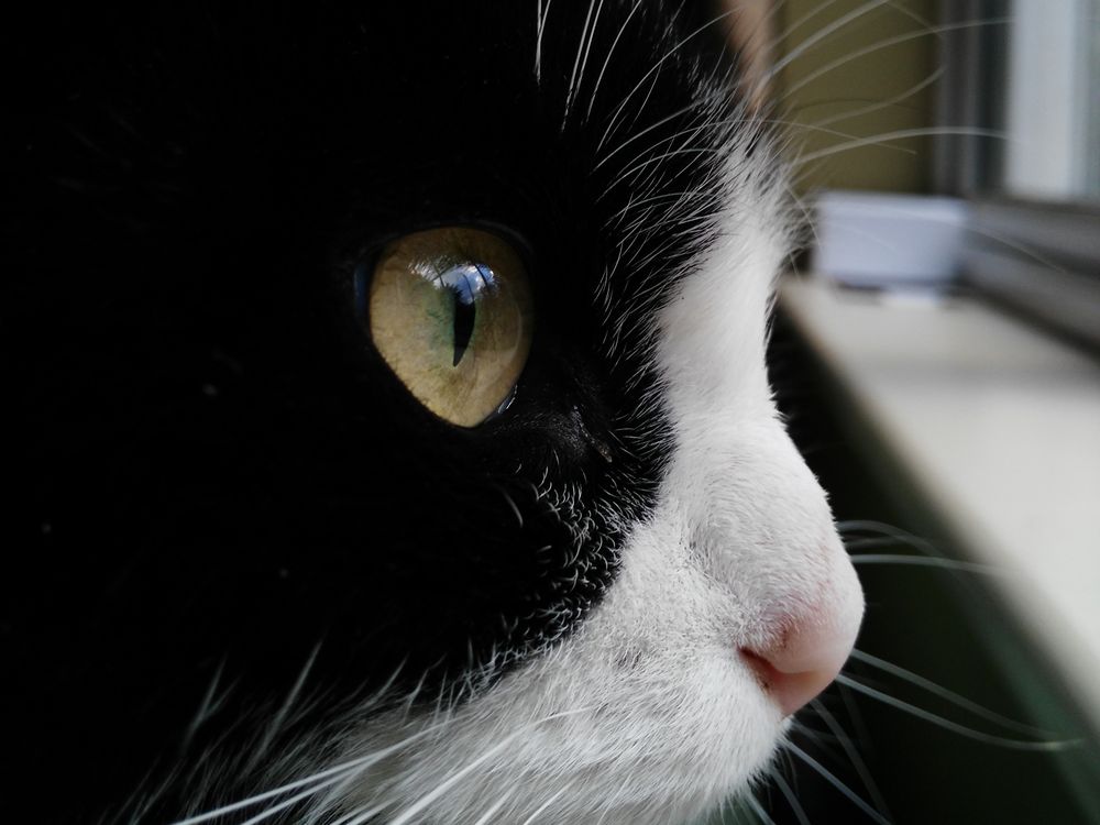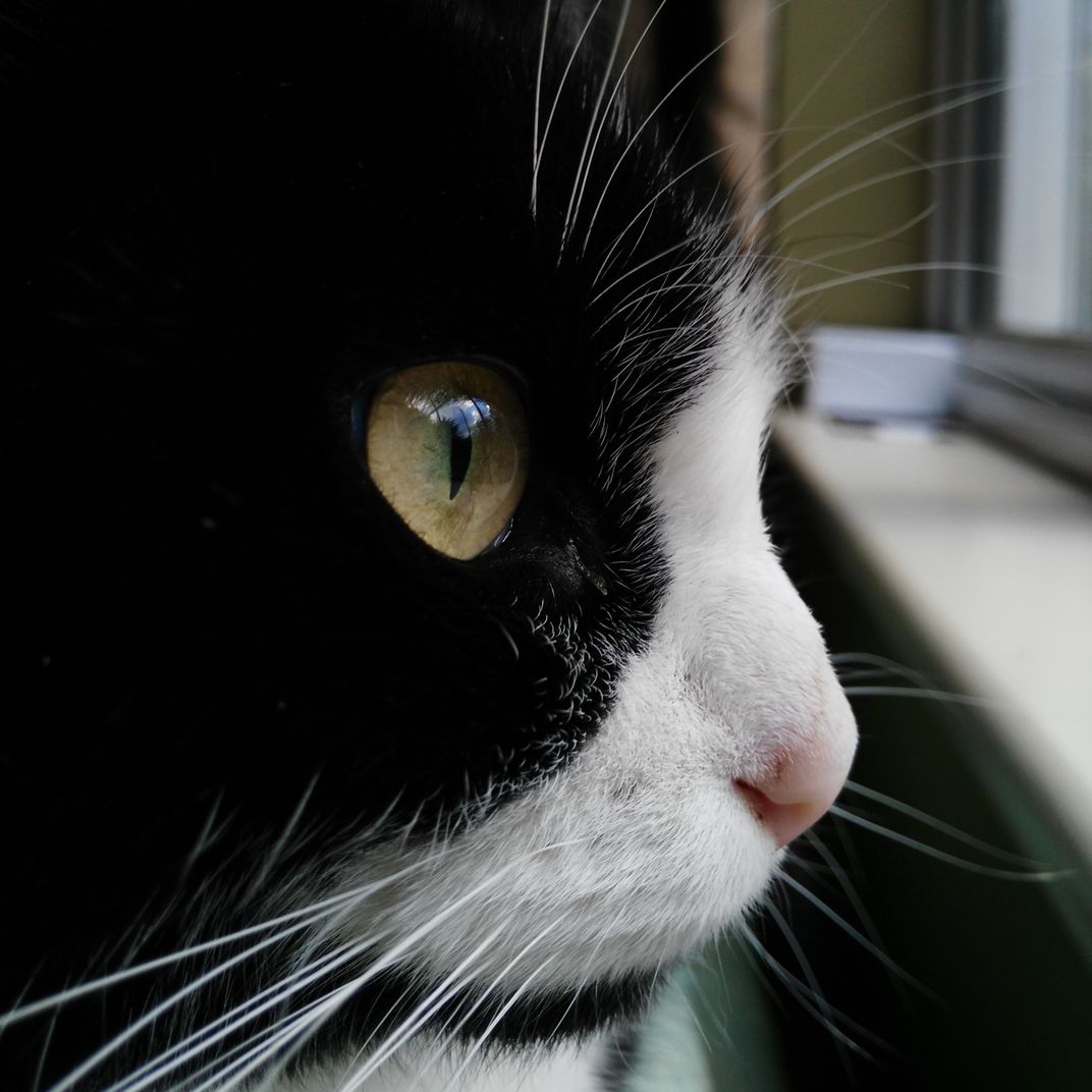 the photo shows a cat sitting inside looking out of a window, there’s a reflection of what she sees in her eye.