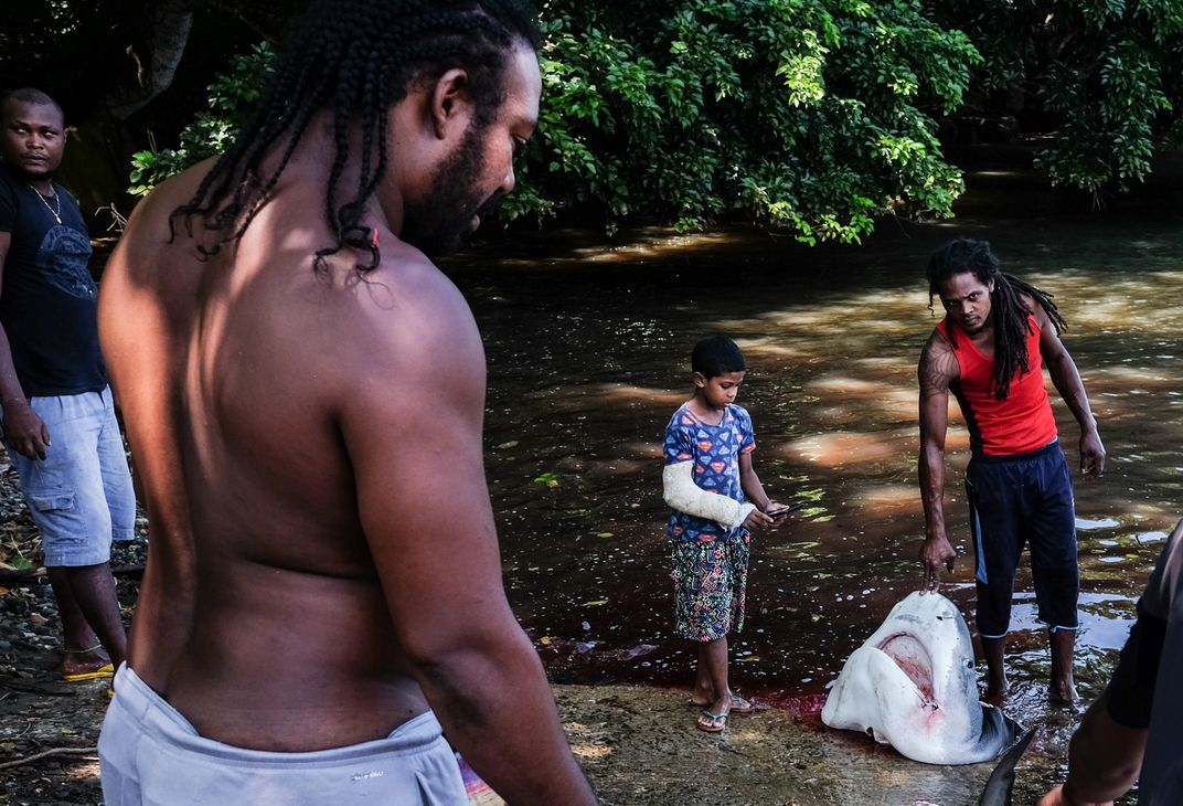 Local fishermen in Mauritius, display a sharks head from the mornings catch.