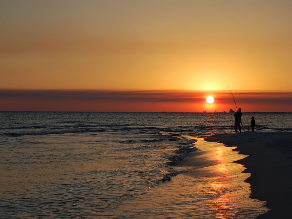 Catching a beach sunset while a man and his son catch fish.
