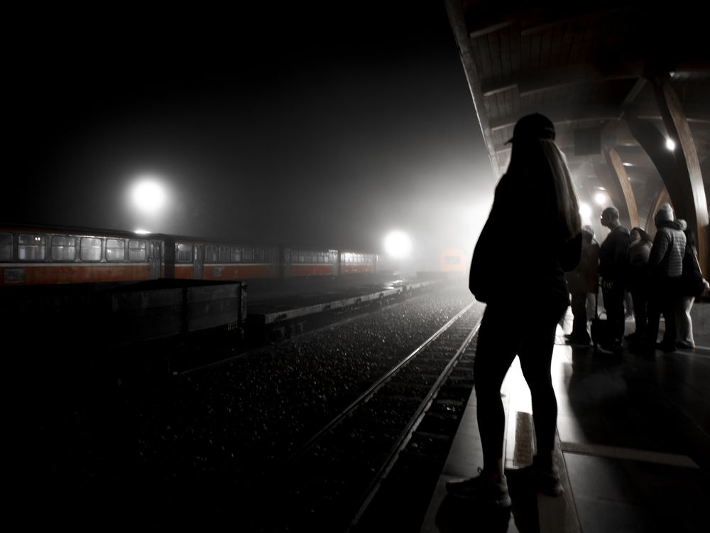 An American traveler waits for her train in Taiwan and silhouettes her self.