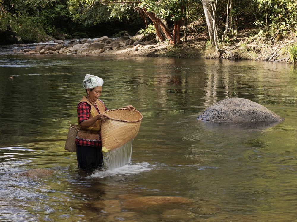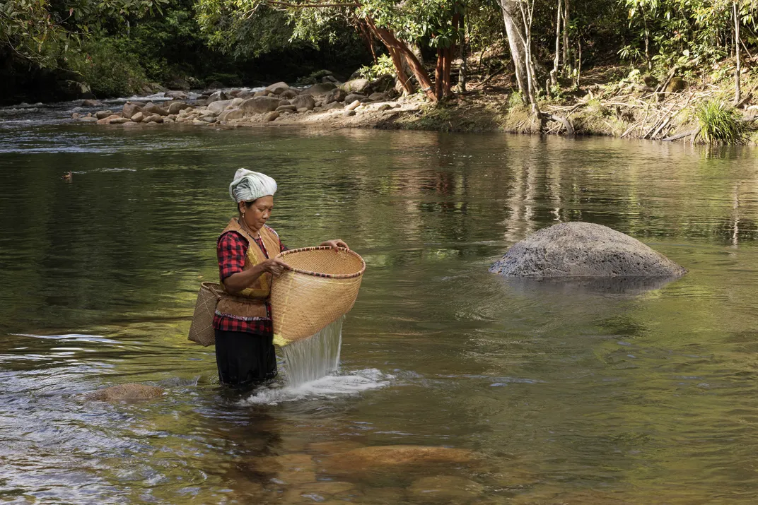 A Dayak woman is catching fish in a river using a traditional tool called menonggu.