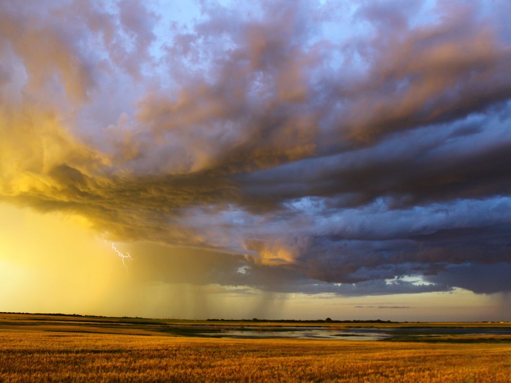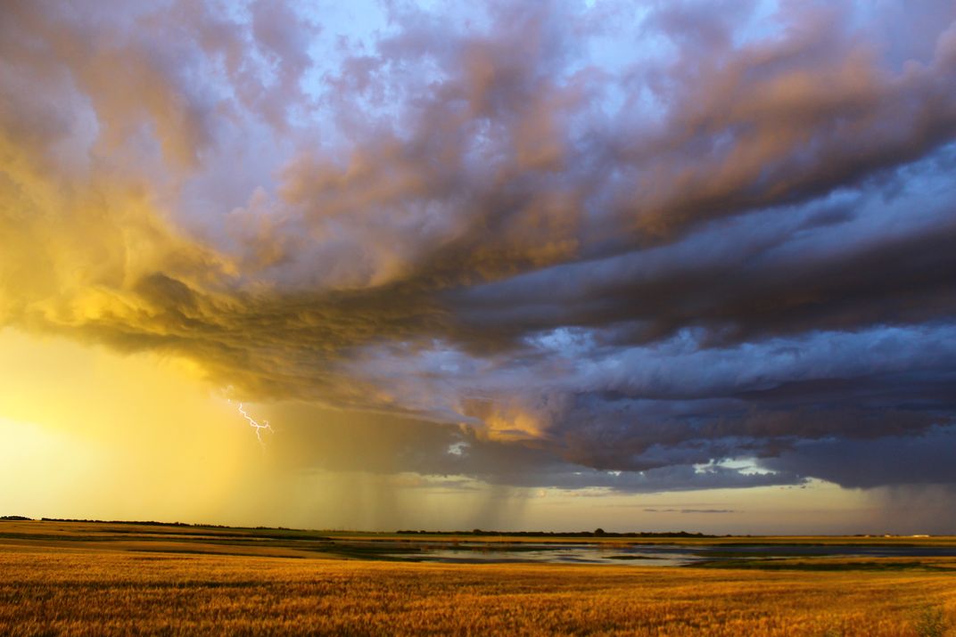 The mix of an amazing sunset and the beginning of a lightning bolt during a thunderstorm over the beautiful farmlands of Minot, North Dakota.