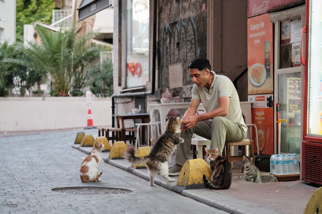 After opening the doors to his convenience store in Istanbul, the shopkeeper's morning routine is to feed the street cats that wander up and down the alley outside his shop. He calls out to them, and they emerge out from bushes and corners. This image captures the love that Istanbulites have for cats, and how much cats are a big part of the city's identity. Istanbulites take care of street cats like someone taking care of a garden - the cats are a part of the daily life in the city.