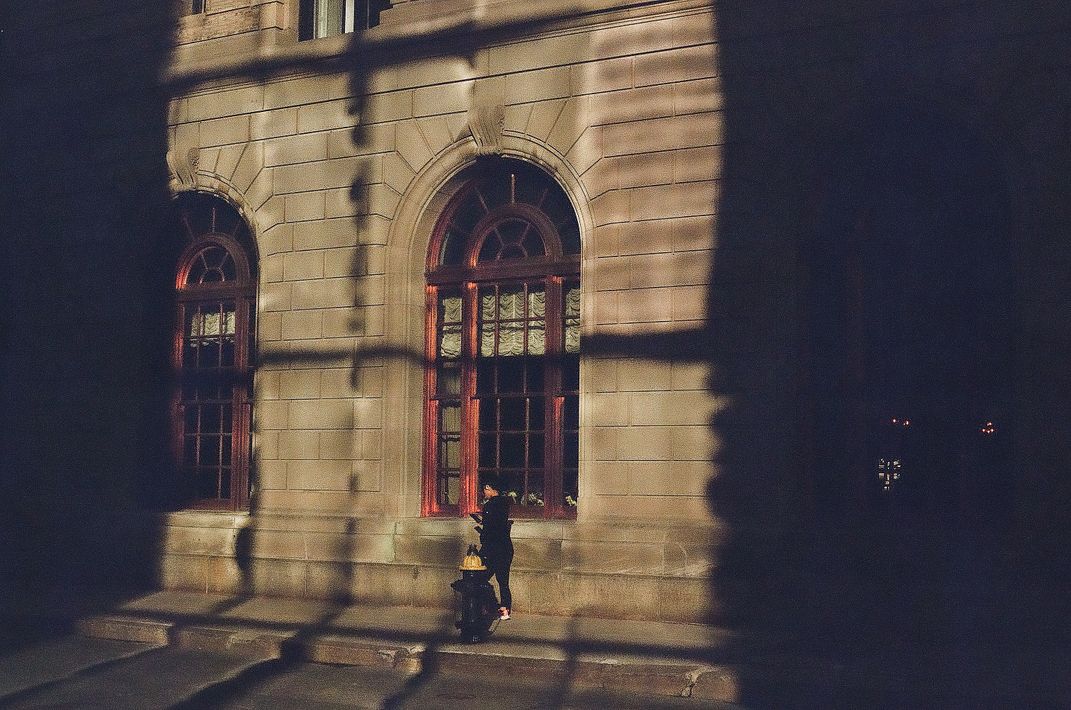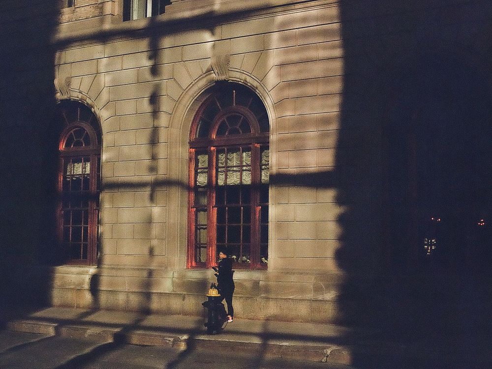 A passerby paused beneath the window. The play of geometry and solitude reflects the quiet intersections of city life—where motion and stillness meet, and a single figure becomes part of the architecture’s rhythm.