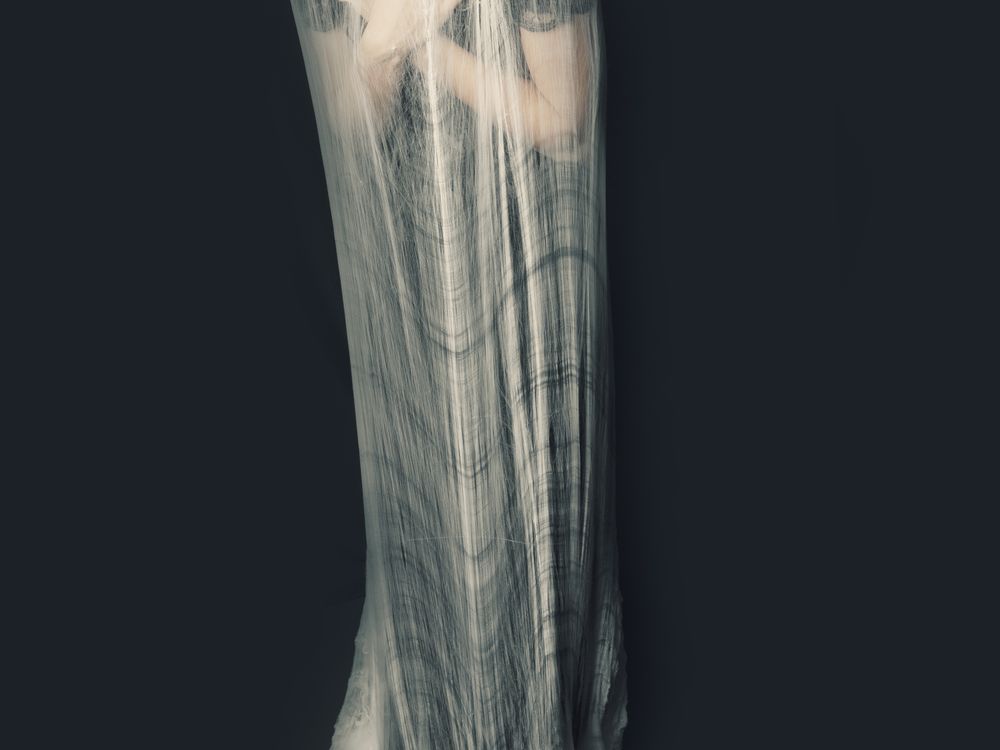 Most of us know the feeling of being trapped, especially emotionally. This image represents one of my interpretations of this condition. The model is arms are crossed and she's standing like a mummy because she feels like dying. Her sheer shroud shows she has not given up and there is still a chance for escape.