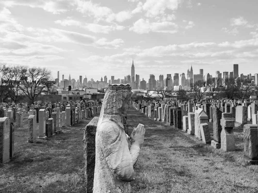 The New York City skyline viewed from a cemetery in Queens.