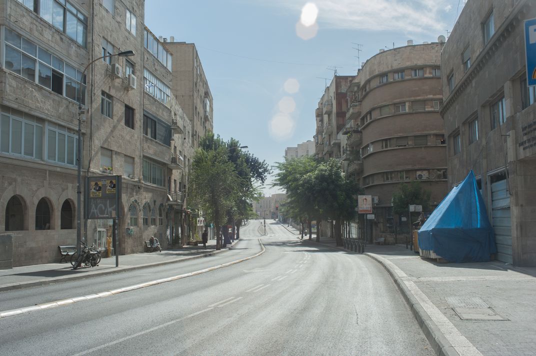 From Friday sundown to Saturday sundown, the Jewish sabbath is observed. This is shabbat, in Jerusalem midday. Ordinarily the streets would be filled with cars and the sidewalks would be occupied by city life on foot.