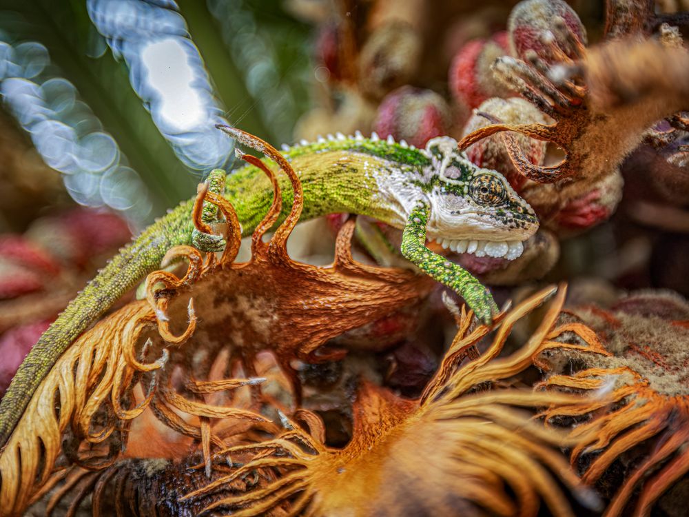 A Natal Midlands dwarf chameleon (Bradypodion thamnobates) blends into its habitat among the reproductive fronds of a cycad. Native to South Africa, this vulnerable species depends on intact forest patches in the KwaZulu-Natal Midlands.