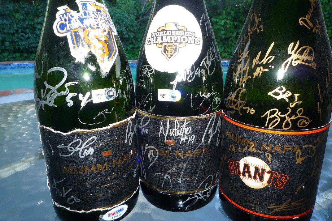 SF GIANTS WORLD SERIES CELBRATION USED TEAM SIGNED CHAMPAGNE BOTTLES PSA/DNA GOT THEM SIGNED IN PERSON SOMEONE IN PEBBLE BEACH BOUGHT THEM ALL FOR 3K