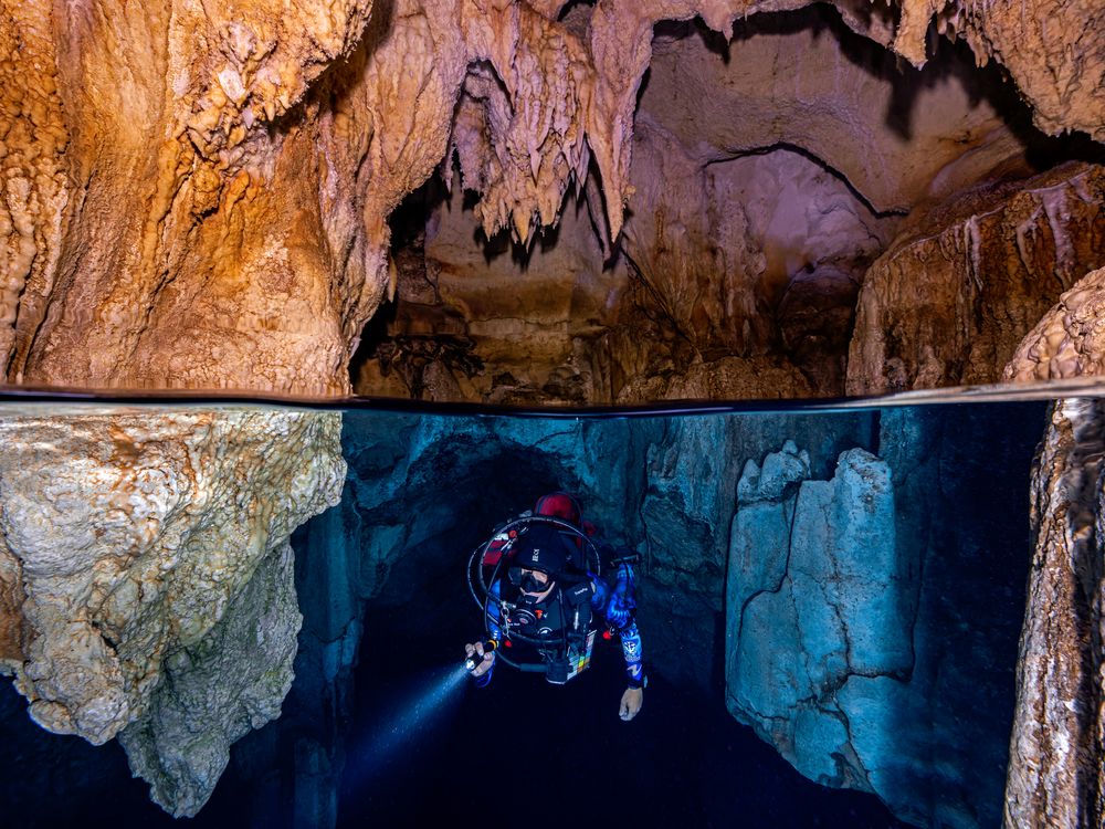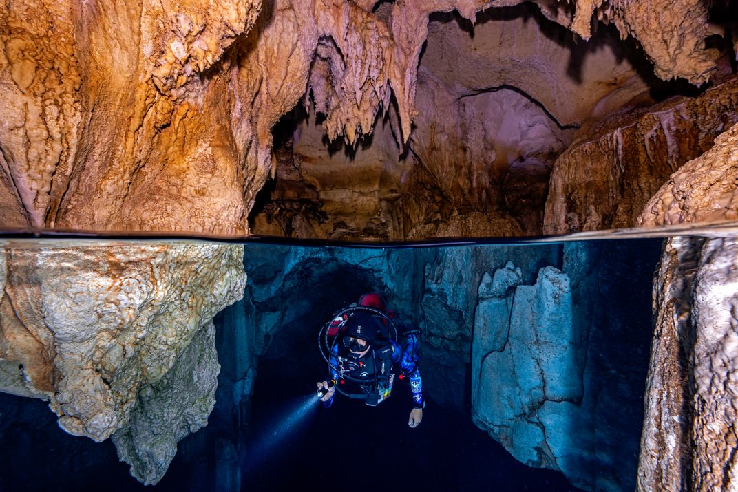 A glimpse into the enchanting realm where the sea and subterranean wonders collide. Here, a diver gracefully navigates the ethereal beauty of the Chandelier Cave in Palau, where the above world meets the mysterious below in a dance of light and shadow.