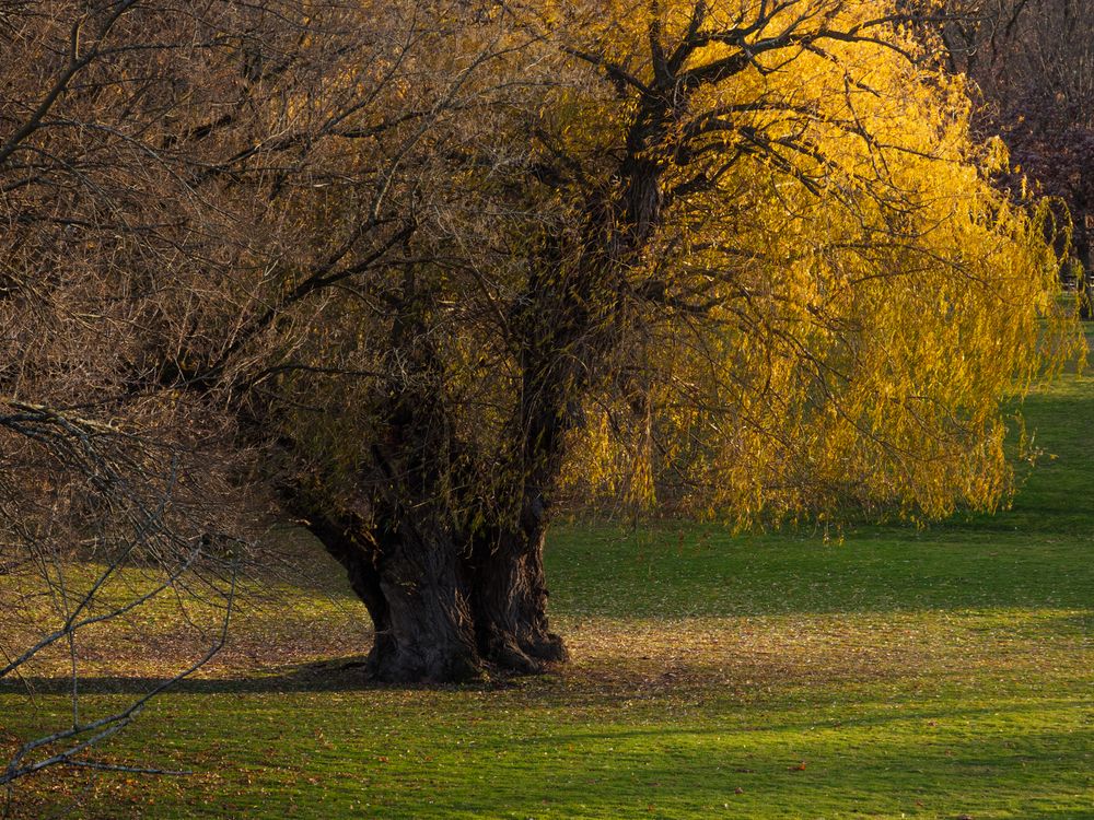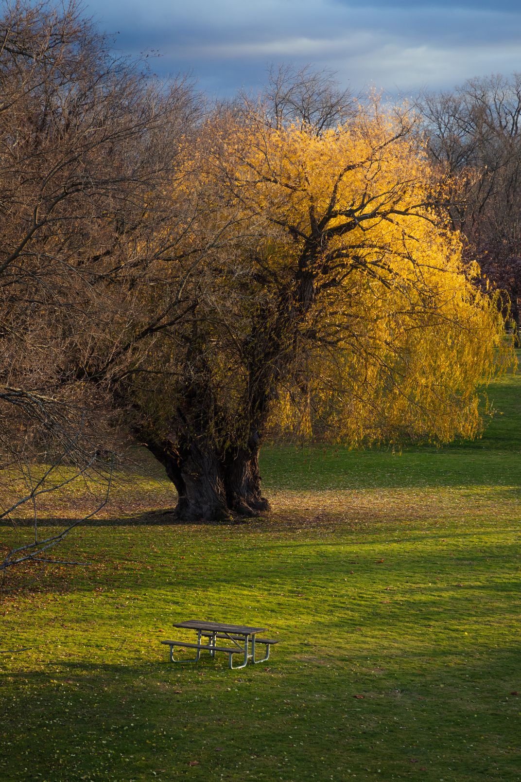 A photograph of a tree changing color in the Fall time. An empty picnic bench is nearby. Seeing this sight made me think about change and how it is natural for people and relationships change over time, just like the seasons.