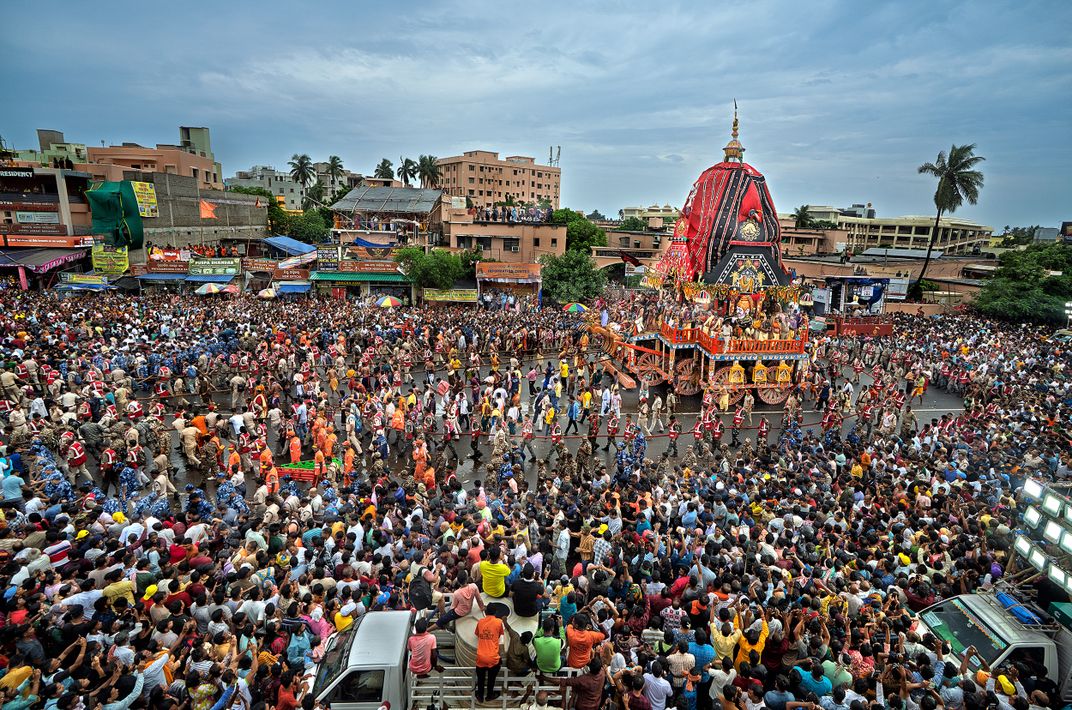 A sea of devotees surges through the streets as the grand chariot festival procession rolls forward. Drummers, priests, and security form moving layers of colour and rhythm, while thousands gather to witness the sacred journey under a dramatic monsoon sky