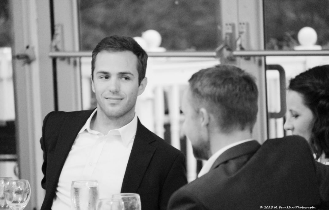 A quiet intrigue surrounds him calm, crisp, and keen, as if catching secrets beneath the room’s chatter. The scene feels cinematic, a whisper of espionage, his subtle confidence echoing the cool of a modern day 007.