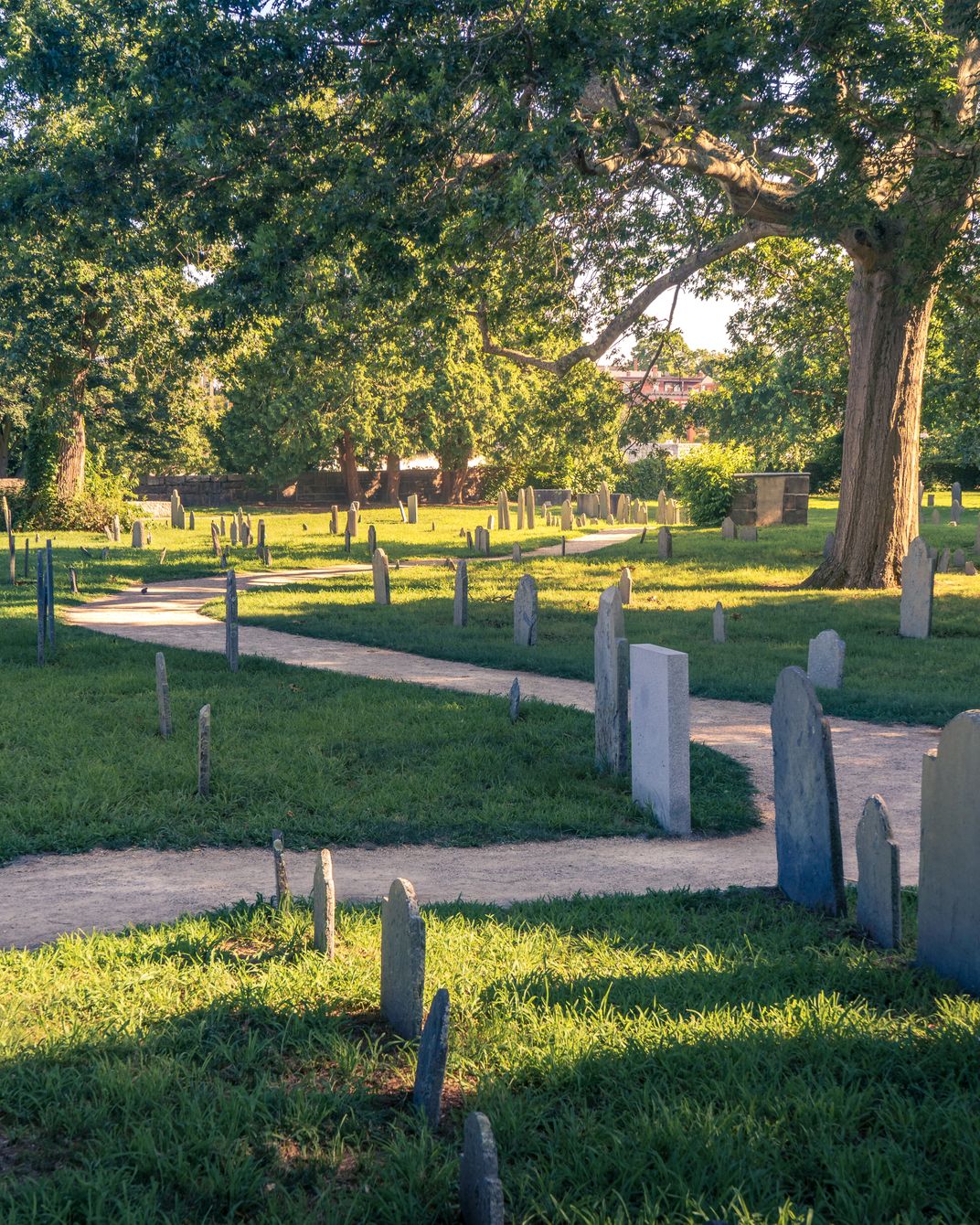 A path winds through gravestones in the Charter Street Cemetery. A large tree to the right stretches its branches across the graveyard. Also known as Old Burying Point Cemetery, this is the oldest cemetery in Salem and one of the oldest in the country.