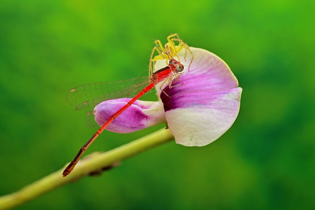 "Chasing" In November 2025, I carried a Canon R5 camera along with a macro lens. In the early morning, on a small path in the countryside of Beicheng Village, Qionghai, Hainan Province, China, I noticed a red string moving on the wild beanflower. At first glance, it seemed to be a very small damselfly, with its tail swaying but not flying. After a closer look, I found that the small damselfly's head was bitten by a small cat spider, making it unable to move. I quickly raised the camera to focus and, wow! I clearly saw the cat spider catching a beanfly several times its size. Pressing the shutter unexpectedly yielded a wonderful discovery.